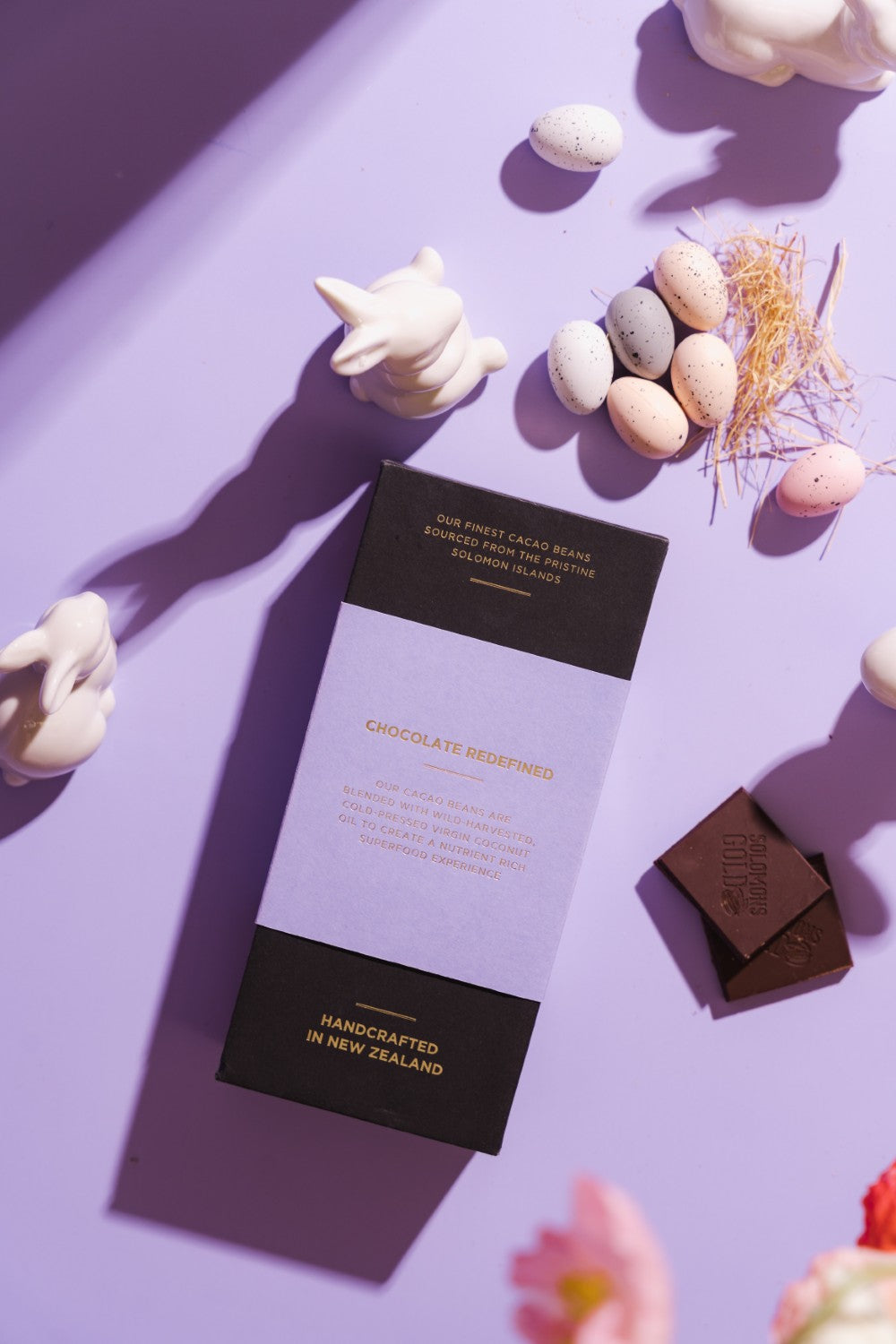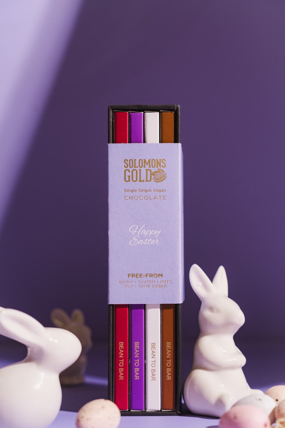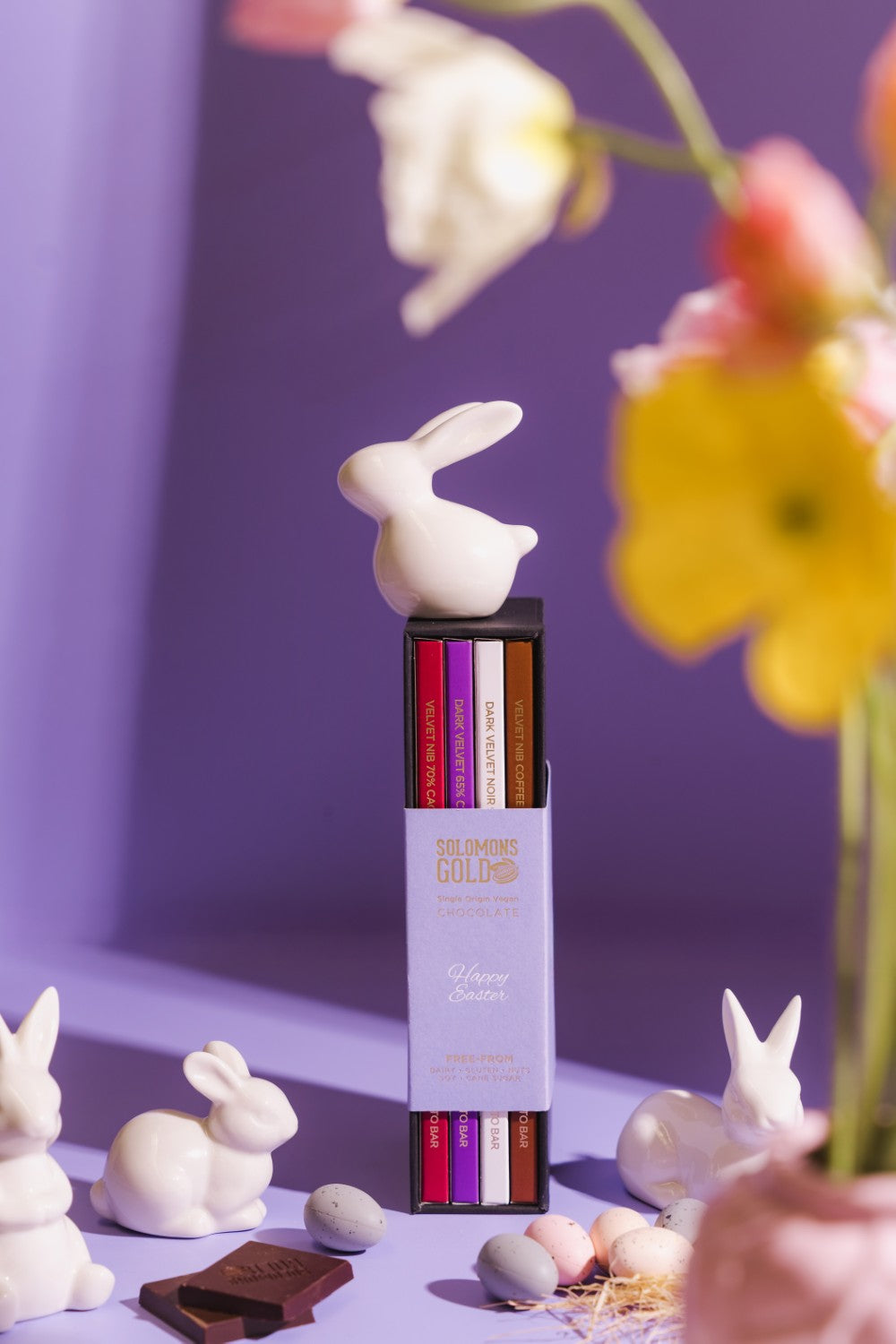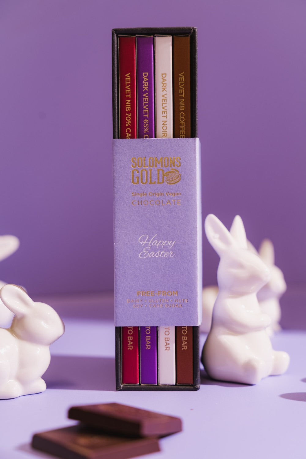 Each Easter gift box includes one of each of premium Velvet chocolate bar: Dark Velvet 65%, Velvet Nib 70%, Velvet Nib Coffee 75% & Dark Velvet Noir 90%.