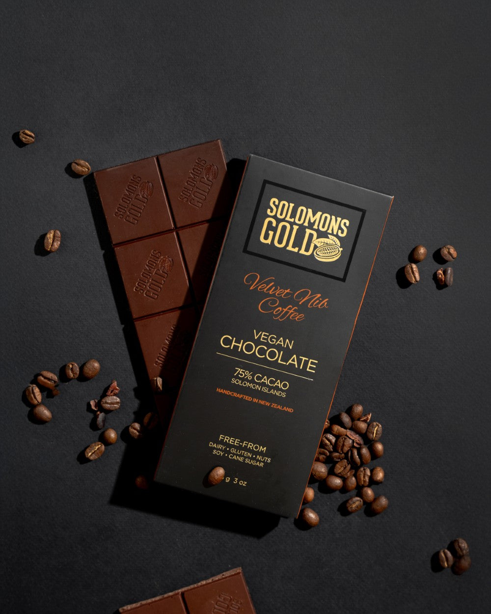 Velvet Nib Coffee 75% is a refined dark chocolate where rich cacao meets the perfect balance of deep coffee notes. Crafted from 75% single-origin Solomon Islands cacao, it delivers a deeper, complex cacao experience, layered with artisan-roasted cacao nibs that add a satisfying crunch. The result is a velvety smooth chocolate with rich coffee notes and bold roasted cacao character.